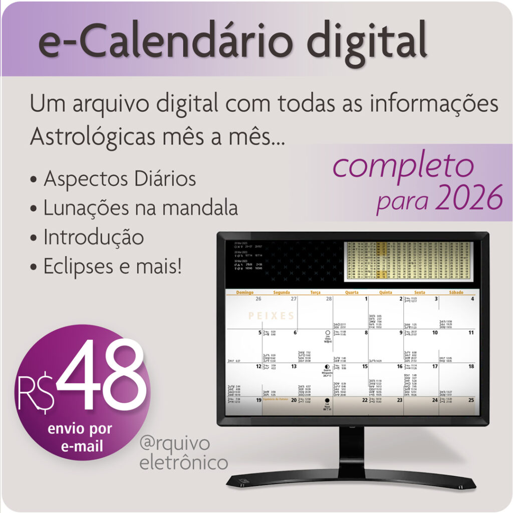 e-Calendário digital com envio por e-mail. Informações Astrológicas completas para 2026, com Aspectos diários, Lunações na mandala, períodos de Planetas Retrógrados, efemérides e muito mais!